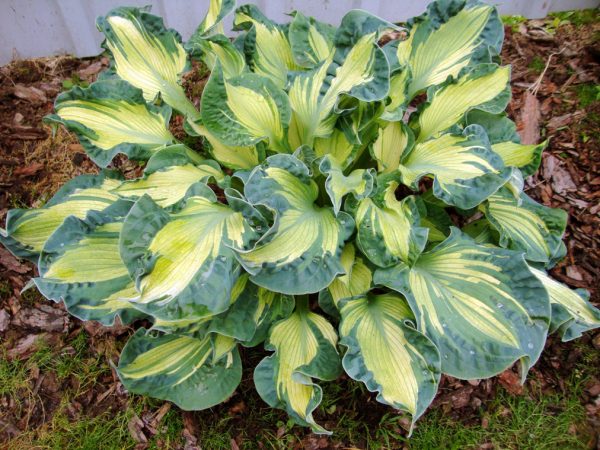 Hosta au feuillage tricolore: centre jaune doré et bordure vert foncé rehaussé de stries irrégulières vert lime. Très joli. Fleurs blanchâtres.