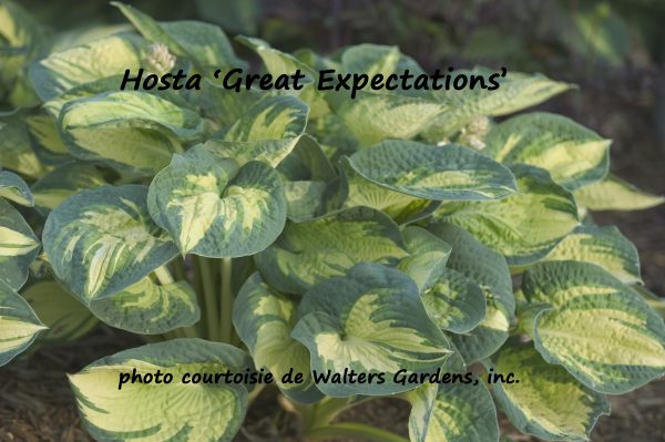 Voici une des plus belles variétés de hostas.  Le cultivar ‘Great Expectations’ est une mutation plus colorée du Hosta sieboldiana; ce hosta est prisé des amateurs et fait l’objet d’une grande diffusion. Ces qualités sont reconnues et ce cultivar est lauréat de nombreux prix, dont l’American Hosta Society, Alex J. Summers Distinguished Merit Hosta. Le feuillage mesure 85 cm de diamètre et 55 à 60 cm de hauteur; les feuilles cordées présentent un centre du limbe d’abord jaune vif devenant jaune verdâtre, autour d’une large bordure ou marge d’un vert bleuté. Les fleurs tubulaires blanches se développent sur des hampes florales de 70 à 80 cm de hauteur. La plante ne souffre pas de l’appétit des limaces.