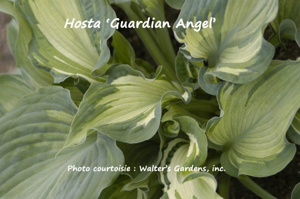 Introduction 2014. Le cultivar ‘Guardian Angel’ est une mutation du Hosta ‘Blue Angel’. C’est un plant de grande taille qui peut atteindre 60 à 70 cm de hauteur et 1,00 à 1,20 m d’étalement. Le limbe des feuilles cordées au coloris bleu verdâtre à vert bleuté, selon les points de vue, présente un centre irrégulier blanc crème à jaune verdâtre. Les fleurs tubulaires lavande pâle sont portées au sommet des hampes florales d’environ 1,00 à 1,50 m de haut.