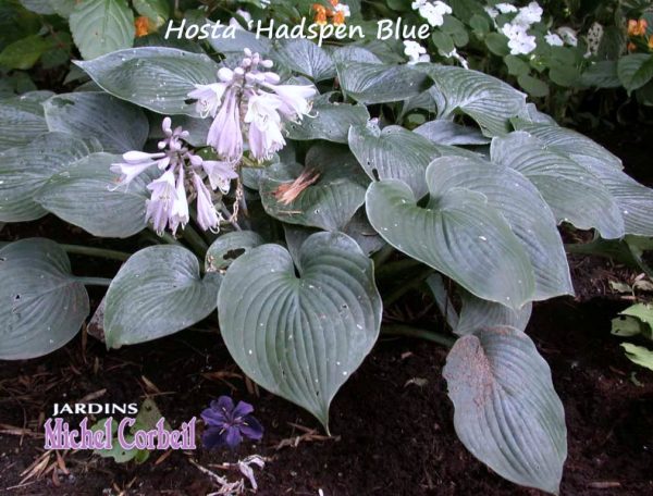 Introduction 2014. Le cultivar ‘Hadspen Blue’ est un Hosta lauréat de la Royal Horticultural Society, issu d’un croisement entre les Hosta tardiflora et Hosta sieboldiana ‘Elegans’. Le plant, aux feuilles cordées-arrondies, épaisses, au limbe très bleu, est considéré comme l’un des cultivars au feuillage d’un bleu le plus «marqué» parmi tous les hybrides. Le feuillage s’élève sur 35 à 40 cm et s’étale d’autant. Des fleurs lavande très pâle presque blanches, tubulaires, sont portées sur des épis lâches au-dessus du feuillage.