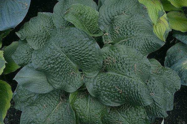 inflorescence blanche. Feuillage texturé et bosselé en forme de coeur, vert foncé teinté de bleu.