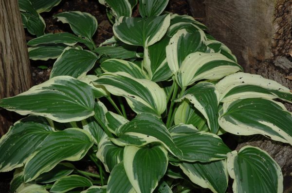 Feuillage vert très foncé, large marge blanche bien définie.  Feuille cordée.  Fleur lavande.  Très populaire.  Résistante aux limaces.