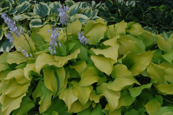 Feuillage jaune, profondément veiné et légèrement ondulé. Feuille ovée, bosselée, pointue. Elle tolère l’exposition au soleil. Port dressé. Fleur lavande.
