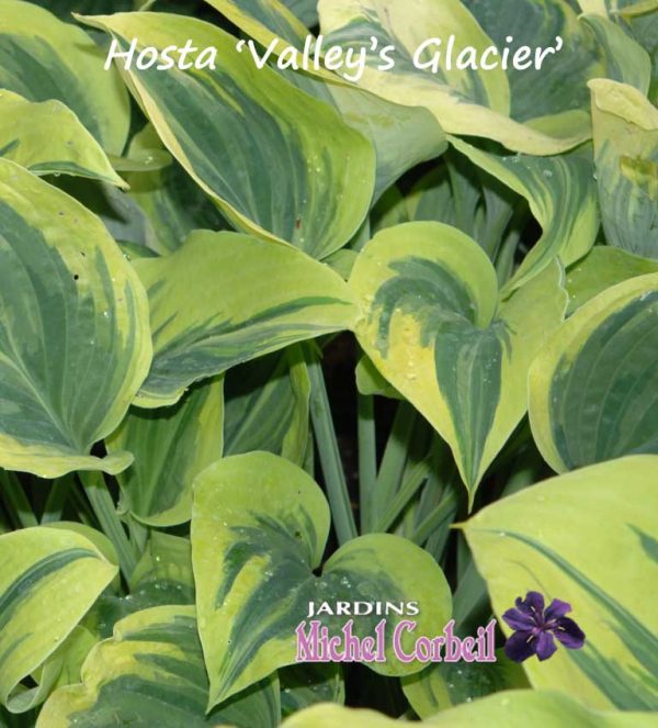 Introduction 2014. Voici un Hosta qui ne passera pas inaperçu dans une plate-bande. Le plant s’étale sur 50 à 55 cm et le feuillage s’élève sur 30 à 35 cm. Les feuilles cordées-allongées, aux limbes veinés, jaune à jaune verdâtre avec un centre irrégulier bleu verdâtre. Les fleurs tubulaires lavande, groupées en épis lâches, s’élevant à 40 à 45 cm. Ce cultivar est une mutation de ‘First Frost’.
