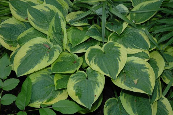 Feuillage légèrement bosselé, vert, marge irrégulière blanc-crème. Feuille cordée. Croissance rapide. Très beau. Fleur lilas. Résistante aux limaces.