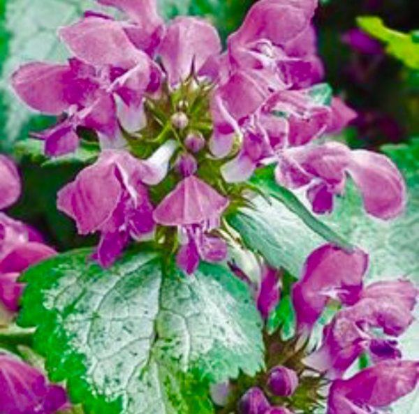 Introduction 2016.Vivace robuste et décorative avec des feuilles argentées aux bordures verts. Des bouquets de fleurs mauves apparaissent au printemps. Utilisé pour bordure, massif, rocaille, couvre-sol.