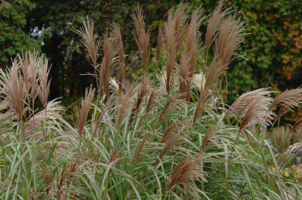 Variété compacte de miscanthus. Feuillage étroit vert. Port plus droit de M. ‘Adagio’ qui est lui aussi une variété compacte. Plumeaux rose argenté de 120cm/ 48 ».