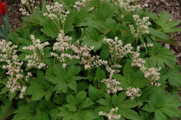 Plante inhabituelle et inusitée au feuillage très décoratif. Grosses feuilles palmées et dentelées vert luisant. La chaleur estivale modifie la coloration du feuillage initialement vert, ce dernier s’orne garduellement d’une bordure rouge pourprée qui gagne la feuille en entier. Les feuilles deviennent donc complètement rouge en fin d’été. Les fleurs étoilées blanches apparaissent au-dessus du feuillage, sur des tiges rougeâtres et poilues.