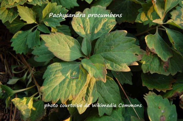 Introduction 2014. La pachysandre rampante (Pachysandra procumbens) est une plante couvre-sol originaire de l’est de l’Amérique du Nord. Moins connues que la pachysandre du Japon (P. terminalis), les feuilles de cette espèces sont deux fois plus larges que celles de l’espèce japonaise et les limbes sont généralement marbrés d’argent mais pas chez tous les plants. Cette espèce rustique (zone 5) prend une teinte automnale brun chocolat avec un peu d’argent. Le feuillage est persistant et s’étale sur 30 cm mais ne s’élève que sur 5 à 10 cm. De petits épis de fleurs blanches avec un soupçon de rose s’érigent au-dessus du feuillage à la mi ou fin mai ou au début de juin sous notre latitude. Une fois introduite, la plante forme lentement un tapis dense. Comme couvre-sol, il importe d’espacer les plants de 20 à 25 cm. La plante demande un sol meuble, riche en matière organique, frais et une situation légèrement ombragé, mi ombragée ou ombragée.
