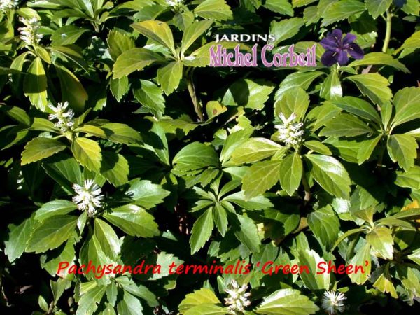 Introduction 2014. Le pachysandre du Japon ‘Green Sheen’, une mutation de ‘Green Carpet’, s’en distingue par son feuillage luisant… très luisant. La plante est un sous-arbrisseau au port étalé, aux feuilles ovales, dentées, vert foncé luisant et persistant groupées au sommet des tiges laissant croire à un verticille de feuilles. Le plant s’élève sur 10 à 15 cm et s’étale, avec le temps sur 40 à 50 cm. De petites fleurs, sans pétales, réunies en petits épis se développant au sommet des tiges feuillées apparaissent au début ou à la mi mai. Mais les inflorescences offrent peu d’intérêt. Un couvre-sol intéressant pour une emplacement légèrement à ombragé dans un sol riche en matière organique, au pH acide, préférablement frais et bien drainé. Pour obtenir rapidement un couvre-sol dense, il faut planter les plants en les espaçant de 25 à 30 cm.