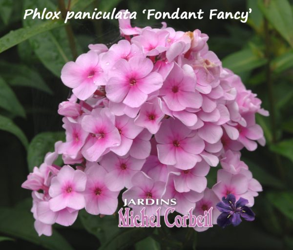 Introduction 2014- Le phlox paniculé ‘Fondant Fancy’ est une introduction de la firme Darwin Perennials. C’est un cultivar défini comme « compact »; les tiges feuillées s’élèvent sur 50 cm de hauteur et le plant s’étale sur 35 cm. Des panicules de fleurs simples rose pâle avec un centre foncé se développent de la mi juillet au début à la mi septembre. Ce phlox est particulièrement résistant au blanc (mildew).