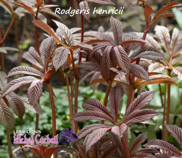 Introduction 2014. Certains botanistes indiquent que la plante identifiée sous le nom scientifique de Rodgersia henrici est de fait une sous-espèce de R. aesculifolia, alors que certains catalogues en font un synonyme de R. pinnata ‘Superba’. Il y a quelquefois des végétaux qui font perdre «leur latin» aux horticulteurs. Peu importe la nomenclature botanique, ce rodgersia porte des feuilles composées, digitées, aux folioles pointues; le plant s’étale sur 80 cm à 1,10 m et le feuillage s’élève sur 50 à 60 cm. Des hampes florales s’érigent à la fin de juin ou au début de juillet; ces inflorescences ramifiées se dressent sur 0,80 à 1,20 m de hauteur et présente de petites fleurs roses groupées en panicules. Le feuillage est d’un rouge bronzé au printemps et devient vert foncé en période estivale.