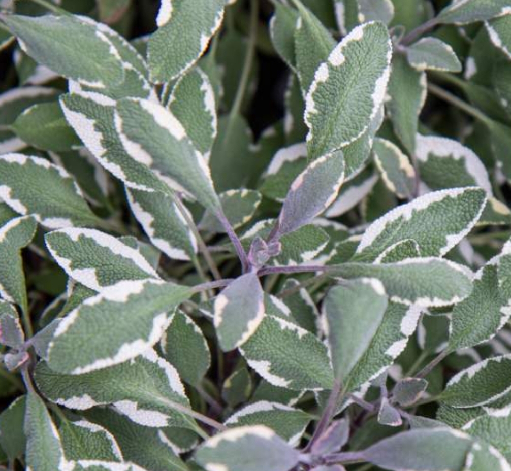 Vivace. Fleur bleue. Décorative. Feuilles vertes panachées crème et pourpre. Utilisation: Viandes, marinades, potages, infusion.