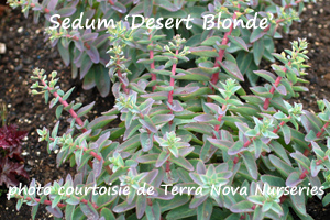 Introduction 2014. La série «Desert» offre des hybrides très compacts et au feuillage coloré; le cultivar ‘Desert Blonde’ a des feuilles charnues d’un bleu-verdâtre, aux tiges rougeâtres. Les tiges feuillées, de 20 à 25 cm de hauteur, portent à leur sommet des corymbes de fleurs jaune pâle; le plant s’étale sur 35 à 40 cm. La floraison débute à la mi ou fin août et se prolonge jusqu’à la fin de septembre. Les infructescences, des graines rouges, sont également décoratives.