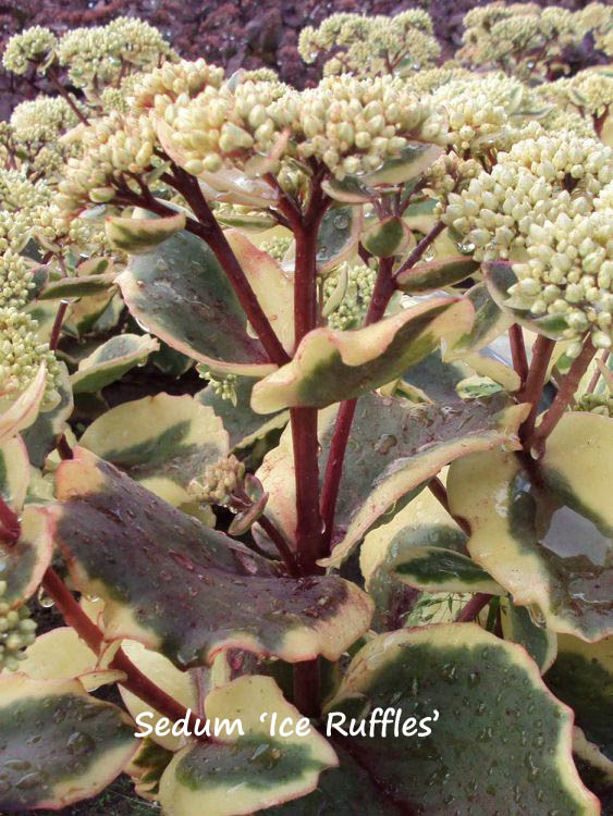Introduction 2014. Le cultivar ‘Ice Ruffles’ est un hybride (Hylotelephium) qui plaira à un grand nombre d’amateurs d’orpin d’automne. C’est une forme panaché, aux feuilles vert pâle bordées de jaune au printemps et vert pourpré bordées de blanc crème jaunâtre à la fin de l’été au moment de la floraison. Les tiges feuillées, rougeâtres, s’élèvent sur 40 à 50 cm; le sommet des tiges développent des corymbes de fleurs étoilées blanc crème à blanc rosé. La floraison débute à la fin d’août et se maintient jusqu’au début d’octobre. Un cultivar étonnant et apprécié pour son feuillage très décoratit.
