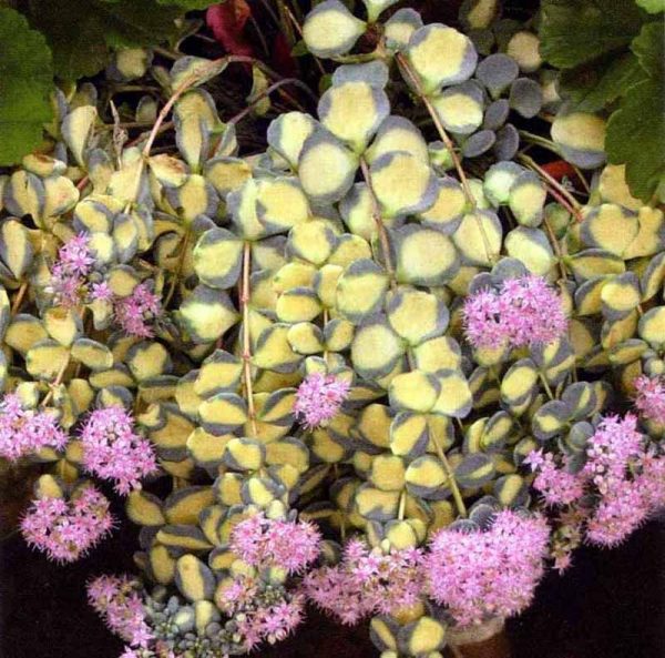Ses feuilles persistantes, arrondies, succulentes sont d’un vert bleuté avec un centre jaune et marginé de rose. Elle produit de petites fleurs roses étoilées. Retirer les feuilles de couleur unique pour maintenir son panaché.