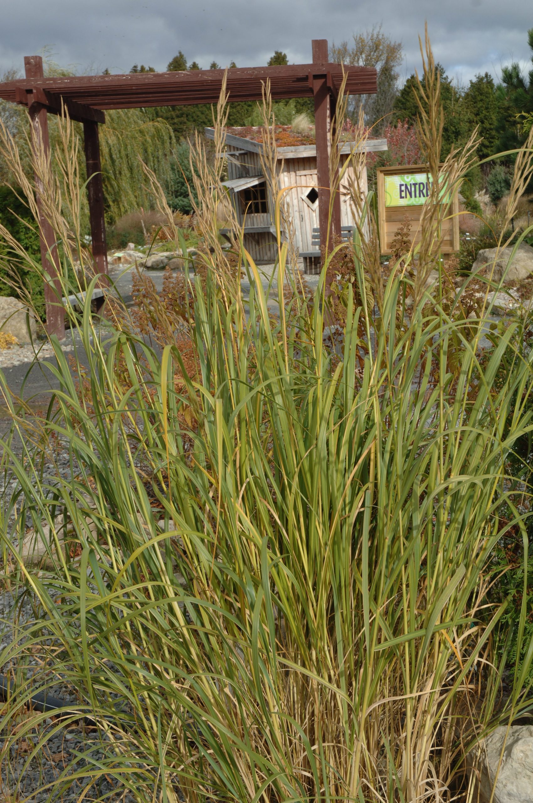 Graminée à feuillage rubané vert marginé de jaune doré.  Forme une touffe élégante aux longues feuilles retombantes. Feuillage légèrement teinté de rose lors de l’émergence printanière.  Inflorescence ramifiées et composées de longs épis cylindiques bruns (180-190cm/ 72-76 »).  Graminée envahissante.